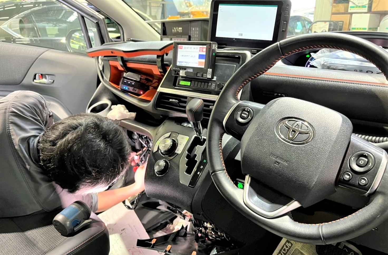 タクシー架装:一般の車両をタクシー仕様に架装します。行灯などの表示灯、料金メーター、無線機、自動ドアー、配車アプリ端末機などタクシー特有の装備を取付ます。